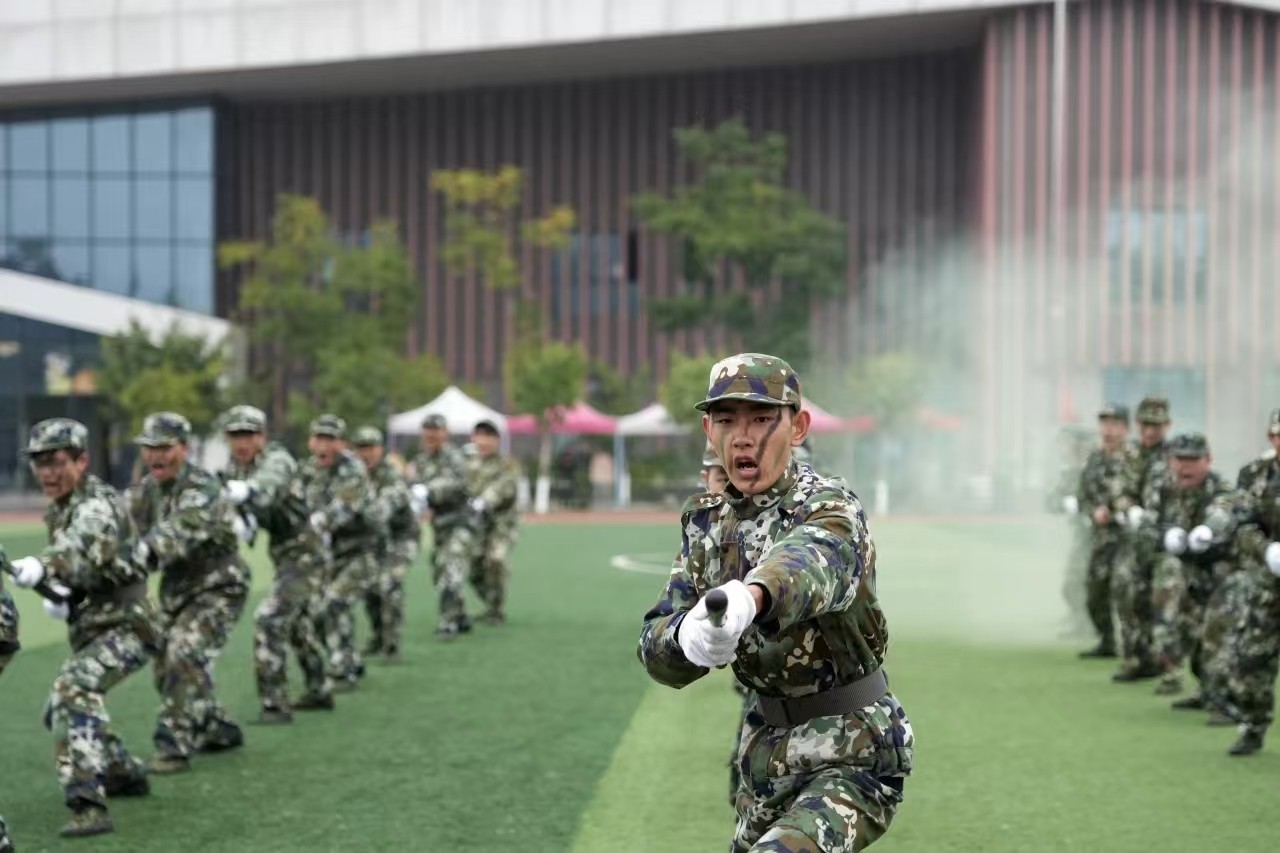 伴隨著激昂的國(guó)歌,國(guó)旗護(hù)衛(wèi)隊(duì)邁著鏗鏘有力的步伐入場(chǎng)。全體新生喊著嘹亮的口號(hào),精神抖擻、氣宇軒昂地走過(guò)主席臺(tái),接受分列式檢閱。刺殺、擒敵拳、匕首操、旗語(yǔ)、戰(zhàn)術(shù)科目依次亮相,匯演過(guò)程中,充分展現(xiàn)了新生們朝氣蓬勃的精神風(fēng)貌。